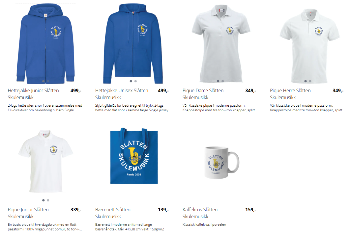 Slåtten skulemusikk har si eigen butikk med kle og diverse med vår logo på.